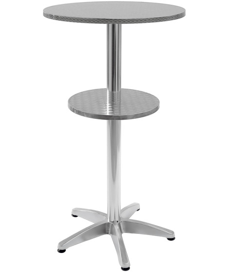 Alta mesa redonda hecha con un doble estante. Base de aluminio anodizado y la parte superior en acero inoxidable. materiales muy resistentes, durables y adecuados para su uso al aire libre. Para bares, cafeterías, residencias, restaurantes, hoteles locales frente a la playa, bed & breakfast, establecimientos de baño. Ideal para sus espacios al aire libre, jardines o terrazas.