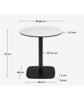 Una mesa bonita, elegante, práctica y resistente. Ideal para bares, restaurantes, hoteles, fabricado en columna redonda de acero pintado en polvo negro. Tapa redonda en HPL blanco, un material muy práctico, resistente a las manchas, golpes y abrasiones, altas temperaturas, antibacteriano y especialmente indicado para uso en exteriores.