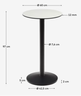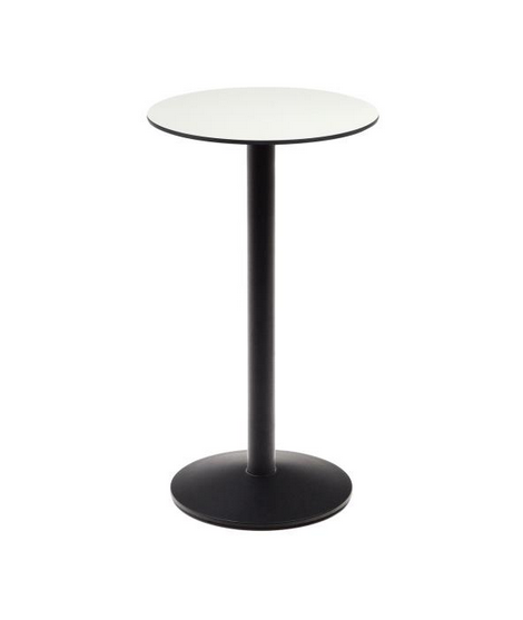 ELA mesa h 97 cm con tapa de hpl blanco 60 cm de diámetro y base de metal pintado de negro para bares heladerías y restaurantes