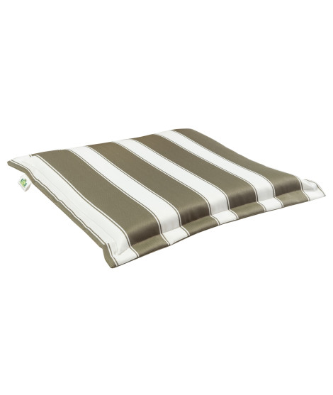 Refinado cojín de asiento cuadrado, para silla de exterior, en un hermoso patrón de rayas marrones y blancas, con el respaldo en un color sólido igual al color de la raya marrón y con volantes. Confeccionado en tejido de poliéster antimanchas muy práctico, muy resistente, desmontable y lavable a máquina. Maravilloso para dar un toque de elegancia a tu jardín o terraza. Acolchado ultrarresistente de 4 cm de altura.