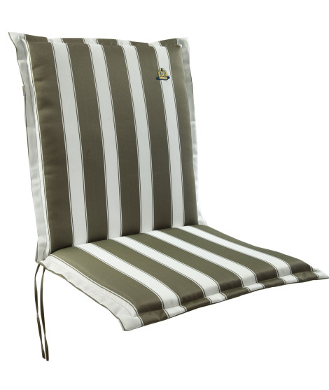 Refinado cojín para sillón bajo, con respaldo de 50 cm de altura, en un hermoso patrón de rayas marrones y blancas, con el respaldo en un color sólido igual al color de la raya marrón y con volantes. Confeccionado en tejido de poliéster antimanchas muy práctico, muy resistente, desmontable y lavable a máquina. Maravilloso para dar un toque de elegancia a tu jardín o terraza. Acolchado ultrarresistente de 4 cm de altura.