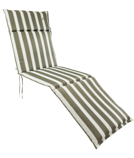 Refinado cojín con estampado de rayas marrones y blancas, perfecto para completar con estilo tus muebles de jardín o terraza. Cojín para tumbonas o tumbonas de exterior, en poliéster con el respaldo en color liso igual al color de la raya marrón y con volantes.