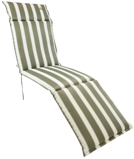 Refinado cojín para tumbona en un hermoso patrón de rayas marrones y blancas, con la parte posterior en un color sólido igual al color de la raya marrón y con volantes. Confeccionado en tejido de poliéster antimanchas muy práctico, muy resistente, desmontable y lavable a máquina. Maravilloso para dar un toque de elegancia a tu jardín o terraza. Acolchado ultrarresistente de 4 cm de altura.