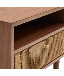 Línea limpia y artesanal para esta mesita de noche con un cajón con sistema de cierre suave y un compartimento. Fabricada en madera de nogal y con detalles de cuerda, cada pieza tiene una identidad única. Elegancia y rusticidad en un solo mueble.