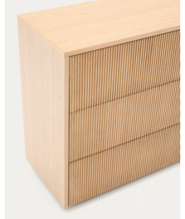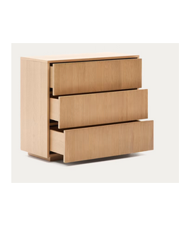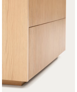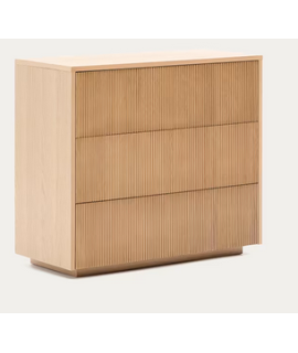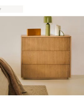 Línea sencilla y elegante para esta cómoda , fabricada en chapa de roble . Cuenta con 3 cajones con apertura a presión y guías ocultas. El efecto de listones de madera, dispuestos uno junto al otro, convierte este mueble en una pieza única que irradia esencialidad y refinamiento. Un magnífico complemento de decoración que aporta luminosidad al ambiente.