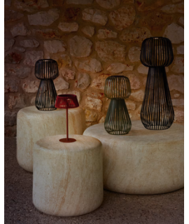 Una impresionante lámpara de pie portátil. Su refinada estructura de varillas metálicas crea un juego de luz al encenderse, creando una atmósfera única y envolvente. Este detalle es, sin duda, el sello distintivo de su elegante diseño, ideal para decorar e iluminar cualquier espacio interior o exterior.