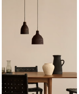 Una cautivadora lámpara de araña con pantalla de madera negra. Esta pieza artesanal logra su acabado oscuro mediante la técnica de pirograbado. Elegante y cautivadora, refinada e intrigante, la luz que emite y la atmósfera que crea son preciosas. Ya sea para un hogar clásico o moderno, sus líneas limpias y elegantes la hacen perfecta para decorar cualquier espacio con gusto.