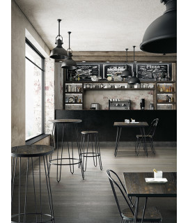 Con un aroma vintage industrial, un taburete con un diseño intrigante, hecho con una estructura de acero pintado en polvo negro y asiento de madera. A continuación se muestran las sillas de la misma línea para combinar.