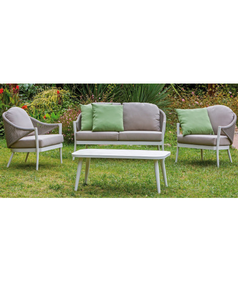 Un encantador juego de salón que se adapta perfectamente a cualquier tipo de mobiliario, para exterior, jardín o terraza, o interior, aporta elegancia al ambiente con un soplo de aire fresco. La sólida estructura, de aluminio pintado de blanco y cuerda sintética gris paloma, se caracteriza por líneas finas y elegantes. El conjunto tiene una gran resistencia a la intemperie ya la exposición solar, dura mucho tiempo y requiere poco mantenimiento. Tanto la estructura de aluminio como las fundas de los cojines arena lavables son fáciles de limpiar, lo que garantiza una gran facilidad de uso. En la foto de la ficha técnica se indican todas las medidas.