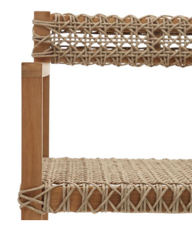 Maravillosa silla con reposabrazos con un diseño limpio e intrigante. Apta para uso exterior, realizada con una sólida estructura en madera maciza de teca, asiento y respaldo en cuerda tejida, tratada para uso exterior contra la intemperie y los rayos UV. Capacidad máxima hasta 130 Kg. En la foto de la ficha técnica encontrarás todas las medidas.