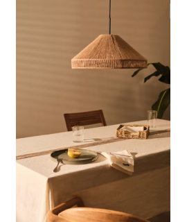 Original y particular plafón para suspensión en metal negro y yute de fibra natural tejida a mano. Es un producto natural, con tonos y texturas únicas e irrepetibles, por lo que puede haber diferencias con la foto, que hacen que este mueble sea único y exclusivo. En la foto de la ficha técnica están todas las medidas. A continuación encontrarás el resto de complementos de la misma línea a juego.