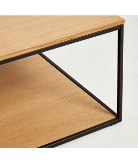 Elegante y con un diseño moderno, una línea sencilla que aporta refinamiento a tu decoración. Mesa de centro en chapa de nogal o roble y estructura de metal pintado negro mate y pies regulables. En la foto de la ficha técnica están todas las medidas. A continuación encontrarás todos los complementos de la misma línea.
