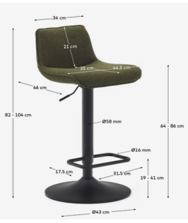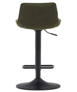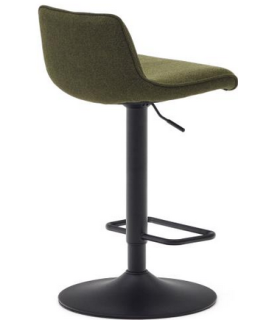 Apto para cualquier tipo de mueble. Taburete elegante y refinado, pero además del diseño también es muy cómodo con un respaldo alto y un asiento cómodo. De gran prestigio y solidez, con moderno tapizado en suave felpilla verde oscuro y base en metal negro. Capacidad máxima 130 kg. En la foto de la ficha técnica están todas las medidas.