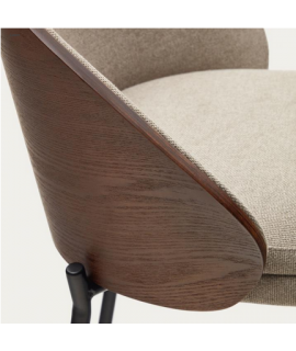 Un taburete con un diseño moderno, bonito y cómodo, apto para cualquier tipo de mobiliario. Refinado y arenoso, pero además del diseño también es muy cómodo. Estructura en metal negro mate y chapa de fresno acabado wengé, tapizada en tejido chenilla marrón claro. De gran prestigio y solidez. En la foto de la ficha técnica están todas las medidas haciendo scroll con las pinzas. A continuación encontrarás otros muebles de la misma línea a juego.