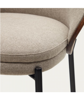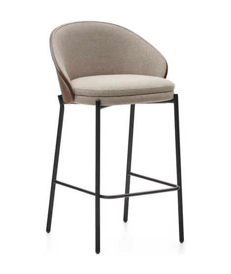 Hermoso y refinado taburete con una línea elegante que da prestigio a sus muebles. Realizado con estructura de metal negro mate y chapa de fresno acabado wengué, acolchado con tapizado en tejido chenilla marrón claro. Muy cómodo y elegante.