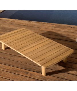 Una mesa de centro de diseño, elegante y refinada, apta para exteriores. Cómoda con sobre de listones de madera maciza de teca, una madera muy resistente para exteriores. Una línea sencilla que aporta sofisticación a tu jardín o terraza. A continuación encontrarás los complementos de la misma línea a juego.