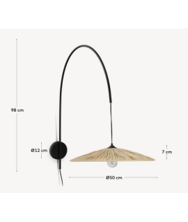 Lámpara aplique original y particular en metal negro y rattan de fibra natural tejida a mano. En la foto de la ficha técnica están todas las medidas. Es un producto natural, con tonos y texturas únicos e irrepetibles, por lo que pueden existir diferencias con la foto, que hacen que este mueble sea único y exclusivo.