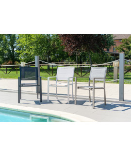Una línea fresca, que aporta sofisticación y prestigio a su ambiente exterior, confortable y resistente a la intemperie. Esta colección está realizada con estructura de aluminio pintado, color a elegir y asiento y respaldo en textileno. Silla con reposabrazos que tiene la característica de una alta resistencia. Muy fuerte, duradero y resistente a los agentes atmosféricos ya los rayos UV. Bonito, elegante y de diseño. Apilable.