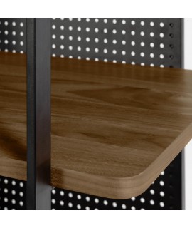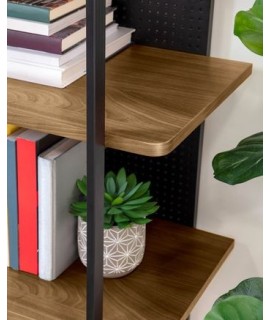 Librería encantadora y elegante, realizada con estructura de metal negro, con panel perforado particular y encimeras de MDF con chapa de nogal. Un diseño esencial y refinado que se centra en la máxima funcionalidad y versatilidad.