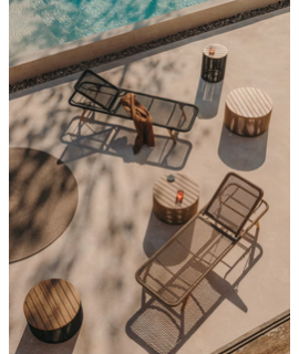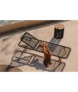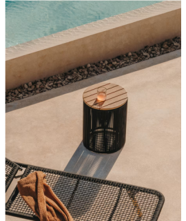 Refinada mesa de centro con estructura de acero inoxidable tratado para exterior, para resistir la oxidación, revestida con cuerda de poliéster resistente a los rayos UV y tapa maciza de madera maciza de acacia. Una línea perfecta que combina un look relajado con una estética intrigante y muy particular.