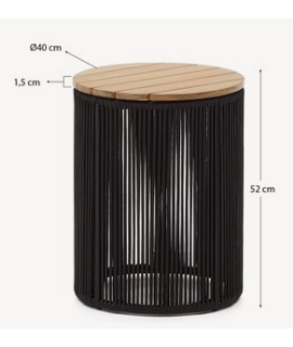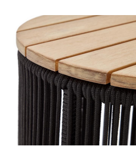 KINDY mesa de centro de ⌀ 40 cm con estructura de acero y cuerda negra o beige y tapa de madera maciza de acacia