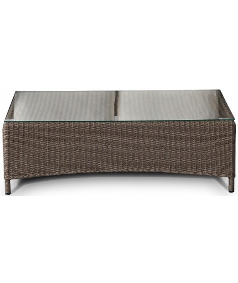 Cen la estructura en Tejido de mimbre sintético en color gris o taupe, y tapa de cristal. Con las colecciones de los salones en mimbre crear sofisticados ambientes al aire libre. Mesa de centro de medidas importantes, completa y con buen gusto decora el exterior o el Interior de la casa.