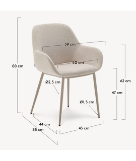 Encantadora silla con reposabrazos, para disfrutar de tu momento de relax y sentirte mimado. Bonito tapizado, agradable al tacto, tejido efecto chenilla beige y base maciza en metal pintado beige. Elegancia y comodidad a tu alcance. Capacidad máxima 130 kg. En la foto de la ficha técnica están todas las medidas.