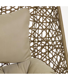 Una esencia colonial mezclada con un diseño moderno, para esta silla colgante. Realizado en ratán tejido a mano, con cojines desenfundables incluidos, en tejido hidrófugo y base de acero. Resistente a la intemperie, a los rayos UV y fácil de limpiar, ideal para exteriores. Cadena, mosquetón y base compatible incluidos. La base de acero se puede desmontar. Adecuado para ambientes interiores y exteriores. Carga máxima 110 kg. Guarda los cojines en caso de lluvia. Todas las medidas están indicadas en la foto de la ficha técnica.