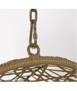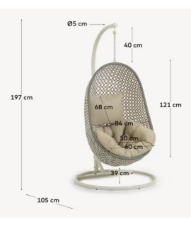 Una esencia colonial mezclada con un diseño moderno, para esta silla colgante. Realizado en ratán tejido a mano, con cojines desenfundables incluidos, en tejido hidrófugo y base de acero. Resistente a la intemperie, a los rayos UV y fácil de limpiar, ideal para exteriores. Cadena, mosquetón y base compatible incluidos. La base de acero se puede desmontar. Adecuado para ambientes interiores y exteriores. Carga máxima 110 kg. Guarda los cojines en caso de lluvia. Todas las medidas están indicadas en la foto de la ficha técnica.