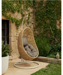 ALMA Sillón colgante en ratán tejido con estructura de acero y cojines incluidos para interior o exterior