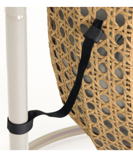 Una esencia colonial mezclada con un diseño moderno, para esta silla colgante. Realizado en ratán tejido a mano, con cojines desenfundables incluidos, en tejido hidrófugo y base de acero. Resistente a la intemperie, a los rayos UV y fácil de limpiar, ideal para exteriores. Cadena, mosquetón y base compatible incluidos. La base de acero se puede desmontar. Adecuado para ambientes interiores y exteriores. Carga máxima 110 kg. Guarda los cojines en caso de lluvia. Todas las medidas están indicadas en la foto de la ficha técnica.