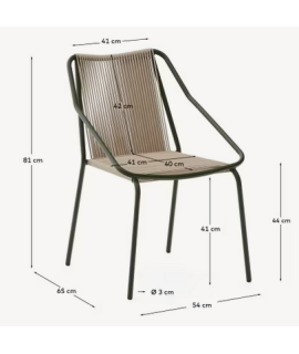 Silla con brazos fabricada en cuerda de poliéster ecru tejida a mano, resistente a los rayos UV. El acero galvanizado verde de la estructura es un material de alta resistencia, ideal para uso exterior, mucho más resistente que el común ya que es resistente al óxido y la corrosión. Apto para interior o exterior. Carga máxima 130 kg. A continuación encontrarás todos los accesorios de la misma línea a juego. Todas las medidas están en la foto de la ficha técnica, desplazándose con las flechas.