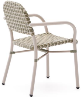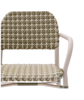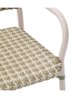 Fabulosa silla con reposabrazos que añade un toque de encanto atemporal a cualquier ambiente. Realizado con estructura de aluminio blanco y asiento y respaldo en ratán sintético tejido a mano en color blanco y verde. Una silla sólida y ligera, cómoda y resistente. Un encantador estilo bistró, que lo hace adecuado para el hogar, la sala de estar o la cocina, el jardín o la terraza y también adecuado para bistrós, bares, heladerías, restaurantes, hoteles y casas rurales. Apilable.