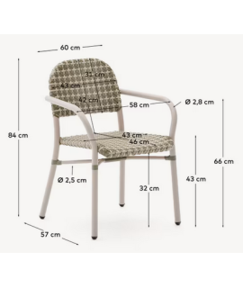 Fascinante silla con estructura de aluminio blanco y asiento y respaldo en ratán sintético blanco y verde tejido a mano. Sólido y resistente a la oxidación, herrumbre, corrosión, intemperie y rayos UV. Perfecto para casa, jardín, balcón o terraza, pero también para contract, bares, cafés, residencias, restaurantes, locales frente al mar, hoteles, B&B, balnearios. Ideal para tus espacios exteriores. Capacidad máxima de carga de 130 kg. Apilable. Todas las medidas estan en la foto de la ficha técnica.