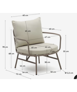Cómodo y refinado sillón, apto para uso interior o exterior. Fabricada con estructura de acero pintado y con cojines desenfundables que se pueden lavar a máquina en frío. El acero redondeado y curvo se destaca en toda su expresión y otorga al ambiente prestigio y refinamiento. Capacidad máxima 130 Kg. Todas las medidas están en la foto de la ficha técnica.