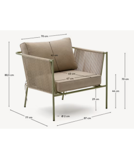 Cómoda sillón en cuerda de poliéster ecru, estructura en acero galvanizado verde muy resistente a la intemperie. Extremadamente práctico para interior o exterior, podrás sacarlo en los meses de verano para estar al aire libre y disfrutar de tu jardín o terraza en compañía de amigos. Un estilo mediterráneo, fresco y atrevido, que combina modernidad con tradición. El diseño y las generosas dimensiones del asiento garantizan una experiencia de comodidad única. A continuación encontrará otros accesorios de la misma línea.