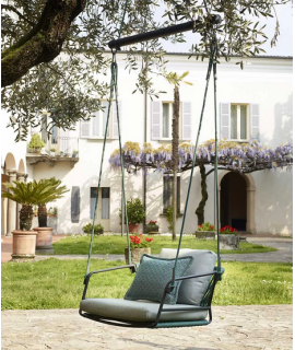 Columpio encantador, un maravilloso asiento suspendido con un diseño llamativo. Gracias a la resistencia y practicidad de los materiales con los que está fabricado, es apto no sólo para el hogar, jardín o terraza, sino también para bares, hoteles o restaurantes. Una línea fascinante para soñar y amueblar con gusto y belleza. A continuación encontrarás los cojines a juego.