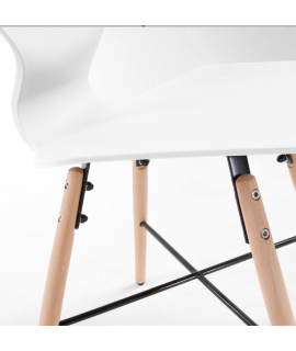 Con asiento en polipropileno blanco perfilado, patas en madera maciza de haya con tirantes de metal negro.