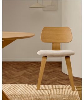 Preciosa y sólida silla, de línea elegante y look renovado. Muy refinado, con una fuerte estructura en madera maciza de caucho con chapa de nogal o roble, destaca tanto por su estética como por su funcionalidad. Maravilloso y cómodo, cuenta con un asiento acolchado recubierto de chenilla beige. Intrigante, con un diseño esencial y un carácter fuerte.