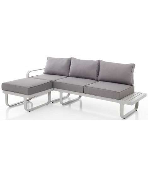 Hermoso sofá con chaise longue, con estructura de aluminio pintado en blanco mate, resistente al sol, a la humedad y al mal tiempo, con cómodos cojines grises en tela repelente al agua. Poco profundo, no voluminoso. Un estilo y diseño únicos. Apto para exteriores.