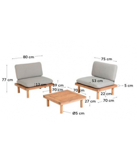 Precioso set compuesto por 4 sillones y 2 mesas en madera de acacia con cojines extraíbles, en tejido hidrófugo e impermeable, impermeable. Ideal para estar al aire libre, la madera de acacia sólida se trata con aceite PNZ con lacado de larga duración y protección UV. Debe recordarse que todas las maderas exteriores deben tratarse con productos especializados. Apto para exterior o interior.