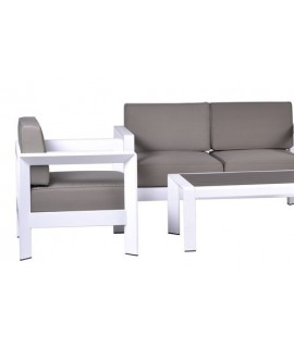 El juego de sala consta de: 2 sillones, 1 sofá de 3 plazas y 1 mesa de café. Con marco de aluminio: blanco, chocolate o gris paloma y cojines forrados en tela gris paloma. Ideal para uso en exteriores ya que los materiales son muy resistentes a los elementos. Una línea fresca y de diseño.