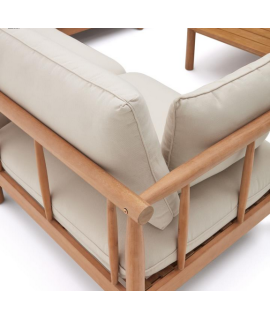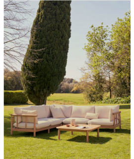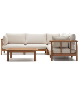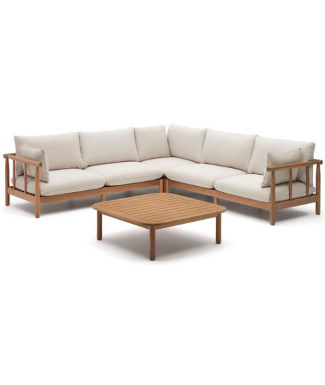 CANCUN juego de esquina 280x280 y mesa de centro en madera de eucalipto para exterior e interior