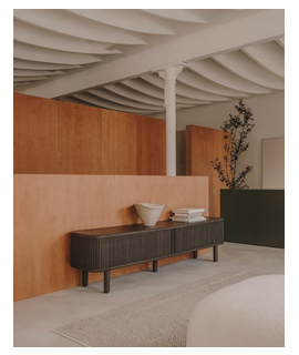 Línea atractiva para este elegante y prestigioso mueble TV. Con 2 puertas correderas, estructura en chapa de acabado ceniza oscuro dispuestas en lamas yuxtapuestas, haciendo de este aparador una pieza única, que desprende esencialidad y refinamiento. Un maravilloso complemento de decoración, que transmite luminosidad al ambiente.