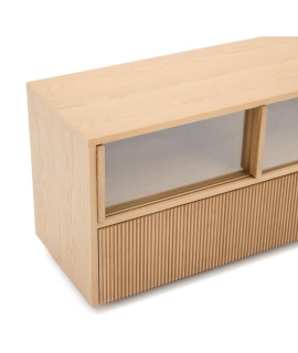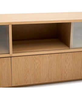 GERUSAL Mueble TV 200x54h cm con puertas correderas y cajones en cristal templado y chapa de roble