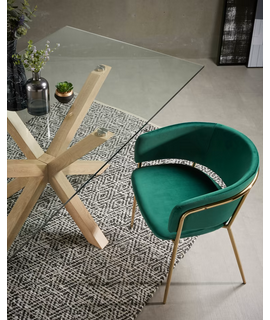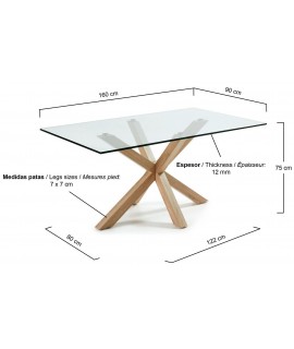 Mesa fija rectangular refinada y elegante con patas de acero pintado de madera natural y tapa de cristal templado transparente. Disponible en tres tamaños. Todas las medidas están en la foto de la ficha técnica.