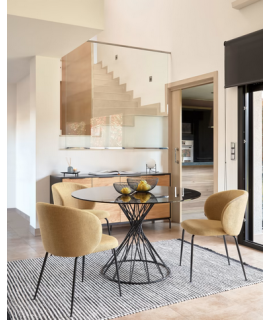Mesa redonda fija con base cruzada en acero pintado de negro y encimera de cristal ahumado refinado. Adecuado para muebles clásicos o modernos.