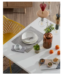 Mesa rectangular fija refinada y elegante con patas de acero pintado de madera natural y tapa de melamina blanca. Disponible en tres tamaños. Todas las medidas están en la foto de la ficha técnica.