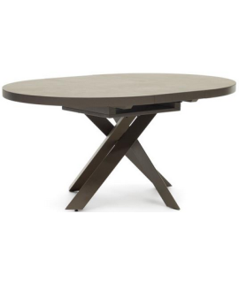 Práctico y funcional con fácil apertura deslizante, pasa de redondo a ovalado con una extensión de 40 cm. Mesa extensible, de diseño y fuerte estabilidad estructural, se abre muy fácilmente, con guías telescópicas de extracción de metal, deslizamiento de las dos mitades del tablero y apertura de extensión de 40 cm con un cómodo asa que facilita la extracción. Una mesa moderna, de gran decoración en su entorno. Fabricado con tapa de cristal cerámico marrón y patas de acero pintado marrón. Importante y de gran estilo. Todas las medidas están en la foto de la ficha técnica.