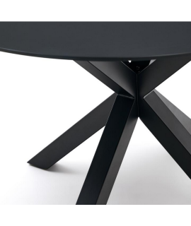Mesa redonda fija con gran tablero en vidrio negro de gran resistencia a cortes y manchas y patas cruzadas en metal pintado de negro. Es la mesa de diseño a elegir, si prefieres un estilo moderno y elegante en casa. Apto para todo tipo de muebles. En la foto de la ficha técnica todas las medidas.